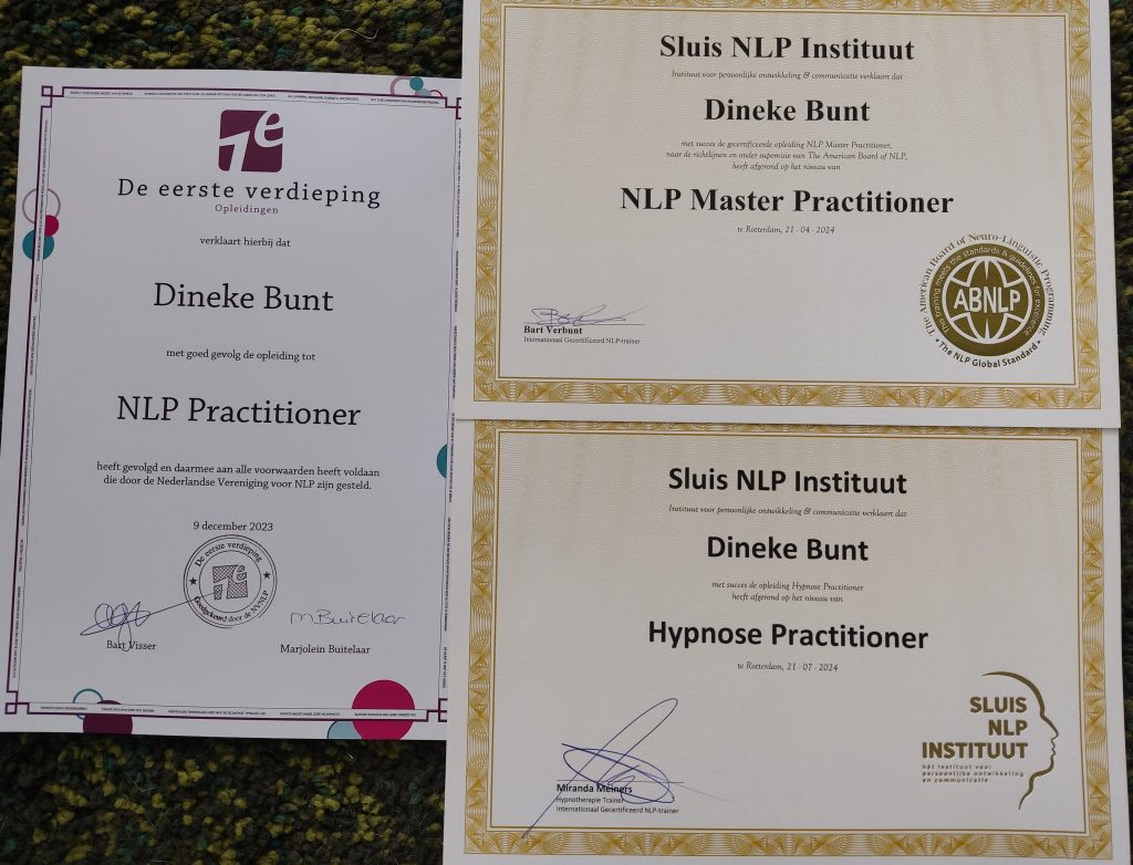 - Maart 2024, de NLP Master Practitioner behaald, via ‘Sluis Instituut‘ te Rotterdam.
